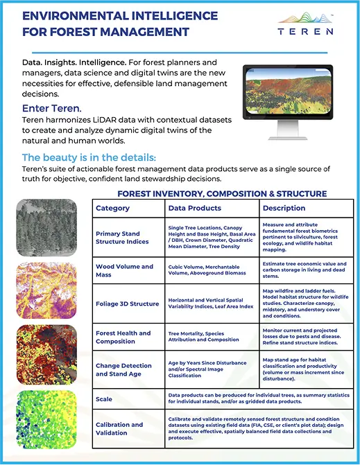 Teren’s suite of actionable forest, watershed and disaster data products harmonize LiDAR data with contextual datasets to create and analyze dynamic digital twins of the natural and human worlds.
